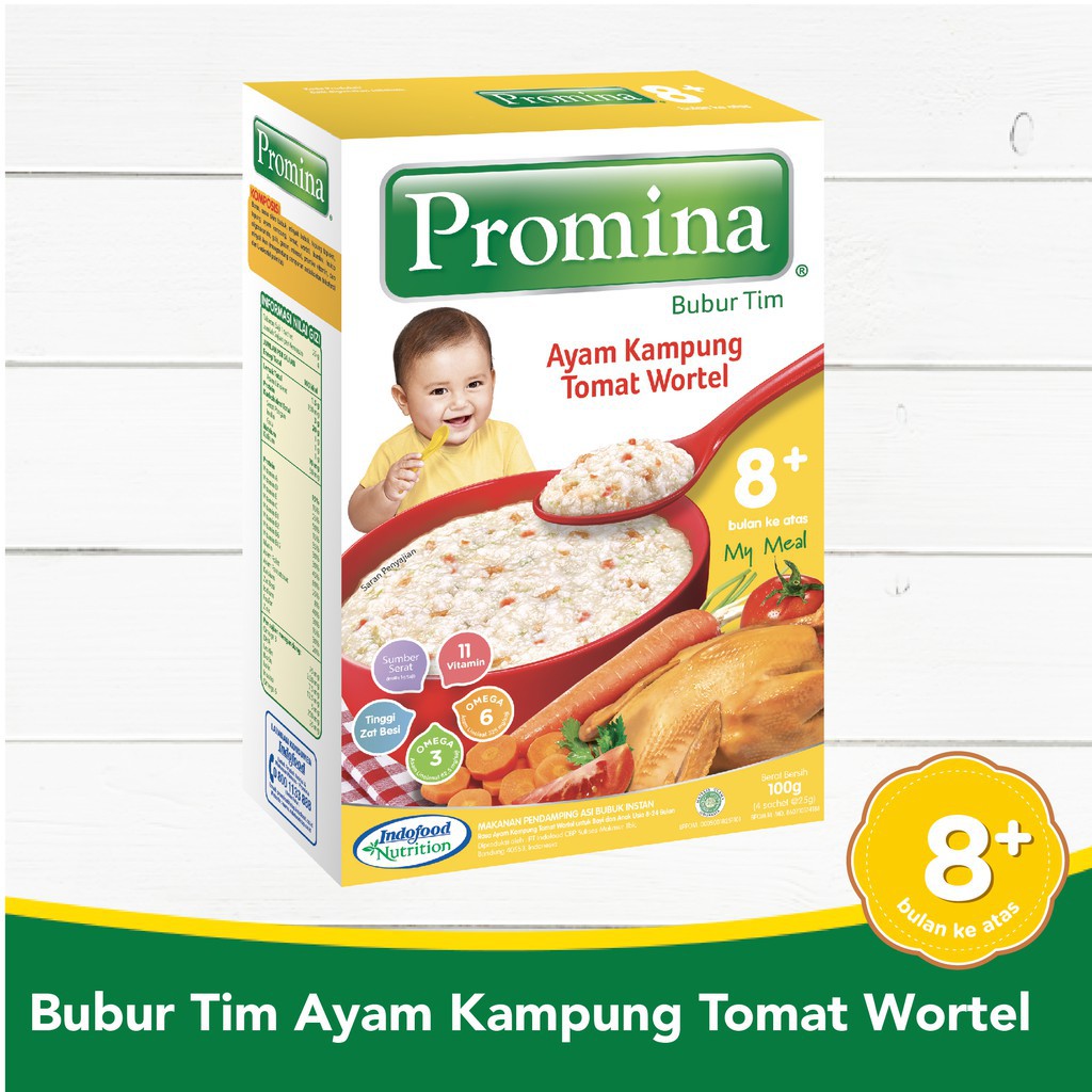 Promina bubur bayi beras merah 120gr. Pilih bubur bayi yang menyertakan varian rasa. Tuangkan 25 g (1 sachet) promina bubur tim ke dalam mangkok bersih 2. Promina bubur bayi 8 bulan mpasi ayam kampung kacang polong 100g. Assalamu'alaikum wr wb hai moms, kali ini aku mau share video cara menyajikan bubur tim promina, tonton terus video aku.